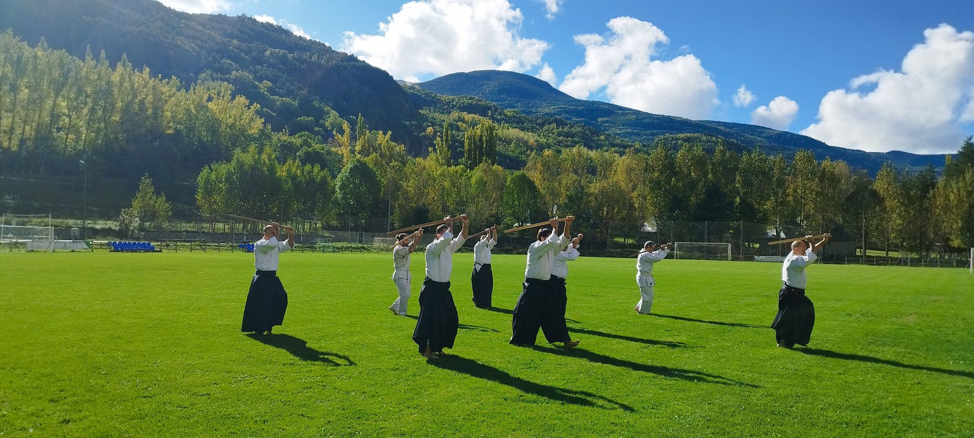 KEIKO BENASQUE                                                      Ya había oído rumores de que se iba a preparar un curso de aikido en losPirineos. Se hizo público y tras una votación para elegir el sitio y los días que duraría, se llegó al siguiente acuerdo, el próximo fin de semana del 28 y 29 de octubre de 2023 está programado un keiko en Pirineos zona Benasque.                                 Ya teníamos fecha y sitio,unos compañeros de la Asociación ATAZ encargados de organizarlo se pusieron manos a la obra.                                Iríamos a estudiar el sistema que desarrolló MorihiroSaitosensei de bukiwaza (trabajo con armas).MorihiroSaitosensei fue alumno directo de MoriheiUeshiba, el fundador del aikido, y se quedó al mando del HonbuDojo en Iwama cuando el falleció. El sistema que Morihiro Saito sensei desarrolló con bokken (espada de madera) y jo (bastón) está pensado y diseñado para fortalecer el cuerpo, el equilibrio, el centro de gravedad, el eje.... Por ejemplo, con el bokken cuando otras escuelas lo usan como sustitutivo de una espada en Takemusu lo usamos como arma "para golpear con él" como si se tratase de un alargamiento de nuestro propio cuerpo,esto hace crear unos fuertes cimientos a la hora de practicar taijutsu (trabajo de mano vacía).                                 La fecha se va acercando y tras enterarnos que la carretera estaba cortada por obras y que tendríamos que desviarnos haciendo el trayecto más largo y daban lluvias en la zona .... por otro lado nos confirman desde Benasque  (la comisión de deportes) que podríamos usar las instalaciones así que, aún con todo, ¡¡vamos para adelante!!                               Sábado 28 de Octubre. Mi despertador suena a las 5:30 h. con sueño pero contento, me espera por delante un fin de semana para hacer las dos cosas que más me gustan, aikido y visitar losPirineos, esas altas y preciosas montañas.  Al paso por Zaragoza y Zuera paro a recoger a unos compañeros, de los cuales alguno de ellos hacia tiempo que no veía y tras un trayecto de unas horas llegamos a Benasque, para nuestra sorpresa el cielo está despejado y ¡¡hace un día inmejorable!! Ahí nos esperan el resto de compañeros tomando café y ya preparados con la ropa de entrenar puesta.                                 Nos desplazamos al lugar donde comenzaremos el keiko y ya con la entrada a las instalaciones nos quedamos sorprendidos. Tras hablar con el concejal de deportes nos instalamos en el campo de fútbol.Cuando entramos ahí, durante unas segundos todos nos quedamos callados y yo creo que un poco abrumados por la belleza de ese lugar.                                 Ya con el kamiza en su sitio comenzamos el keiko, Arturo dice que saquemos el bokken y comenzamos la clase con una serie de suburis, trabajamos el 1 y 5 de los 7 que hay. Arturo comienza a corregirme detalles, tan solo una mirada y un gesto del maestro, es suficiente para entender qué me quiere decir. Cabeza erguida, espalda recta y hombros relajados para que la totalidad de la masa de nuestro cuerpo este en la medida de lo posible encima de nuestro eje y entre el aire que respiramos con naturalidad por todo nuestro cuerpo, pero con el peso abajo para tener una mayor estabilidad y conectar con la fuente de energía. Continuamos con hidari y migi awase (izquierda y derecha juntos) y go no awase (armonía y conexión). En este trabajo uke ataca en yokomenuchi saliendo de la línea, mientras tori defiende en yokomenuchi absorbiendo el ataque yendo hacia atrás y dejando hueco para que uke ataque al otro lado, así cuando tori quiere terminar el ejercicio ejecuta un corte a través del eje de uke. El cuerpo de tori continuará hacia atrás, pero la intención, la energía se proyecta hacia delante, a mi modo de ver es ying-yang, juntar dos polos opuestos, mientras que el cuerpo va hacer atrás representando el control la intención hacia delante marca la potencia. Ya terminamos el keiko con el 5ºkumitachi, el kumitachi es el ejercicio mas parecido a un combate con armas reales, para practicarlo con seguridad se necesita mucha práctica con los suburis.                                 Es la hora de comer con la reserva hecha en el hotel donde están alojados mis compañeros vamos hacia allí, se puede respirar la armonía y el buen ambiente que hay esto hace que se creen muy buenas conversaciones.                                  Por la tarde volvemos de nuevo al pabellón, esta vez nos dicen que nos pongamos en el otro campo de fútbol más pequeño y con otras vistas pero no menos bonito que el de por la mañana, había un trabajador con la cortacésped y olía a hierba recién cortada, cuando me descalzo y mis pies sienten el frescor del césped, tomo aire profundo y miro alrededor, esas montañas me hacen sentir tan pequeño.... Mi forma de pensar es tangible, pero tengo que reconocer que ahí había algún tipo de energía, algo espiritual que no se ve ni se puede tocar, pero sí se podía sentir.                                 Esta hora y media que teníamos por delante la reservamos para trabajar con el jo y comenzamos con el 31 no jo kata; como el mismo nombre dice se trata de un kata de 31 movimientos con el jo, Morihiro Saito sensei lo hizo así para que didácticamente fuese más fácil de aprender, pero en realidad MoriheiUeshiba lo hacía en tan solo un movimiento. Después de varias repeticiones para memorizar el kata comenzamos a hacer la aplicación, la aplicación es como un kumijo, se practica con otro compañero y es necesario cierta concentración pues con un pequeño despiste puedes hacerle daño al compañero, esta vez solo llegamos hasta el movimiento 18 porque se nos terminó el tiempo.Nos hubiese gustado terminarla entera, pero son muchos detalles, el 31 no jo kata creo que puede que sea lo que yo más haya trabajado de bukiwaza y aunque me sentía muy relajado, dispuesto y con la mente abierta, no conseguí la conexió